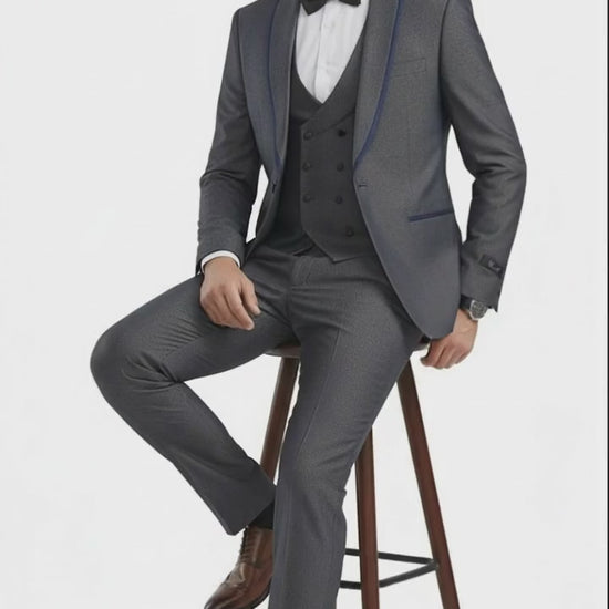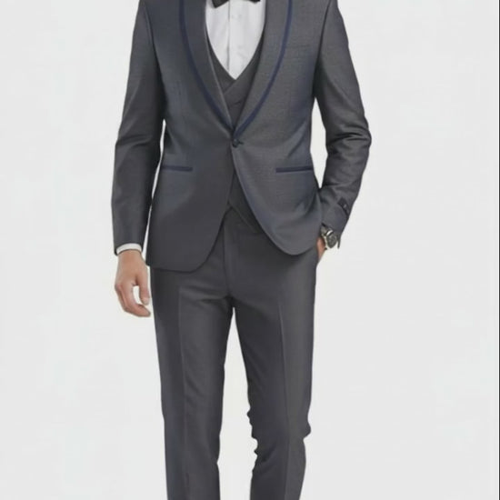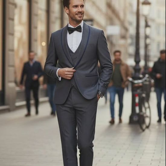 Men’s Charcoal Gray with blue Trim Slim Fit 3-Piece Suit – Modern Wedding and Business Formal Tuxedo Set