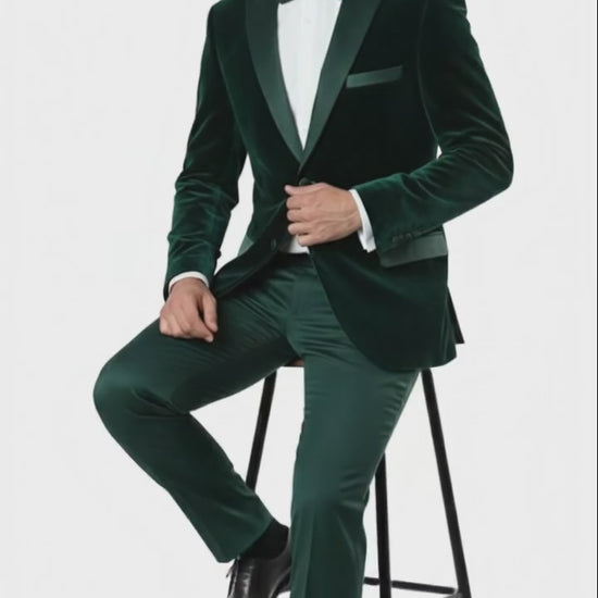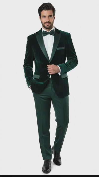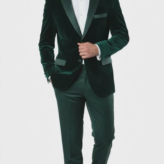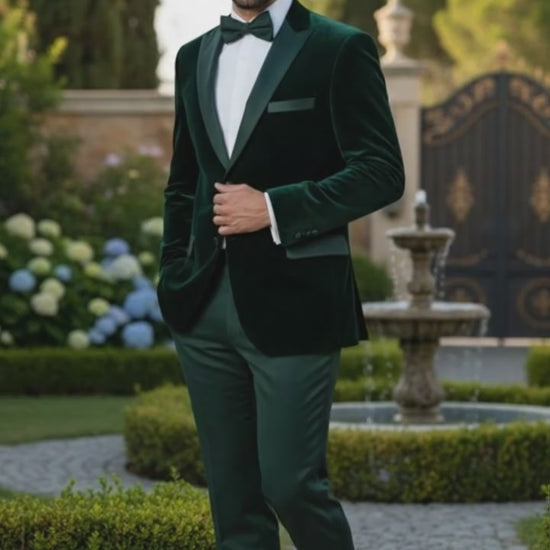 Men’s Dark Green Velvet Tuxedo Dinner Jacket – Slim Fit Formal Blazer with Satin Peak Lapel Lape