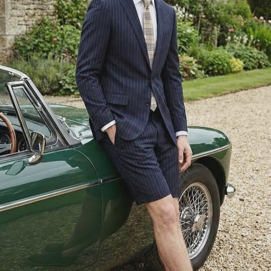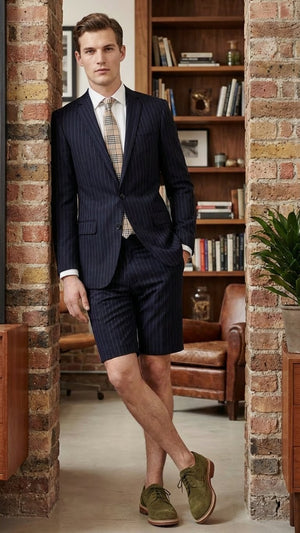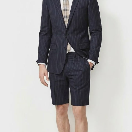 Men’s Dark Navy Blue Pinstripe or Black Pinstripe Summer Business Suit with Shorts Pants Set – Sport Coat Style Formal and Casual Outfit
