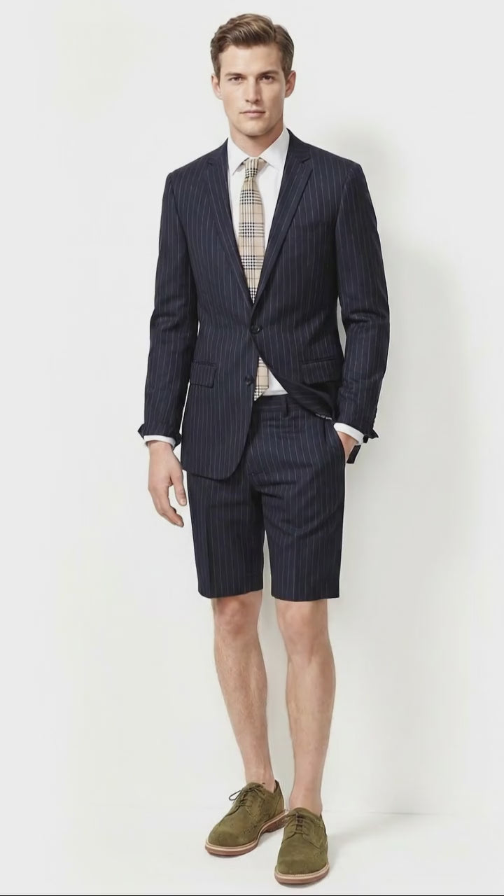 Ideal for men who want a contemporary alternative to traditional suits, this dark navy blue summer suit with shorts is a standout choice for weddings, parties, business events, and fashion-forward celebrations.