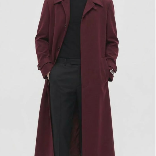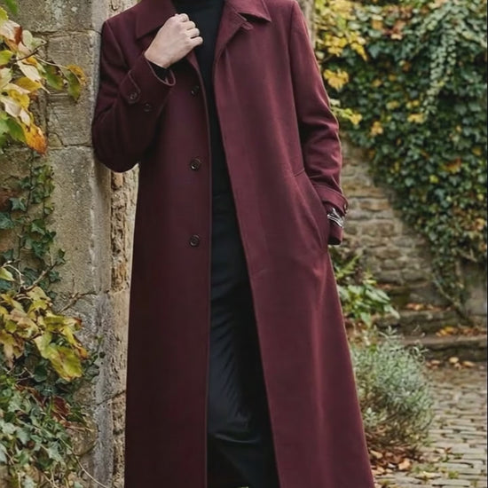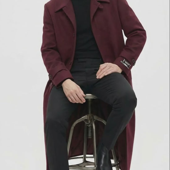 Full-length premium overcoat in a rich burgundy color