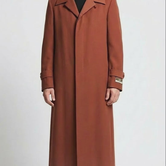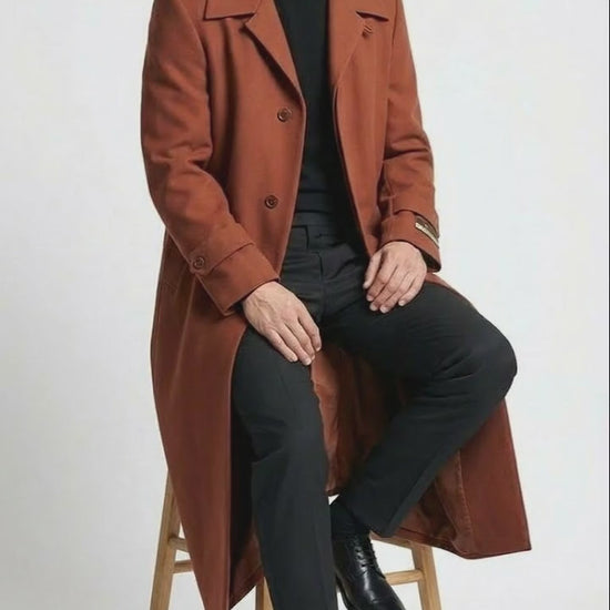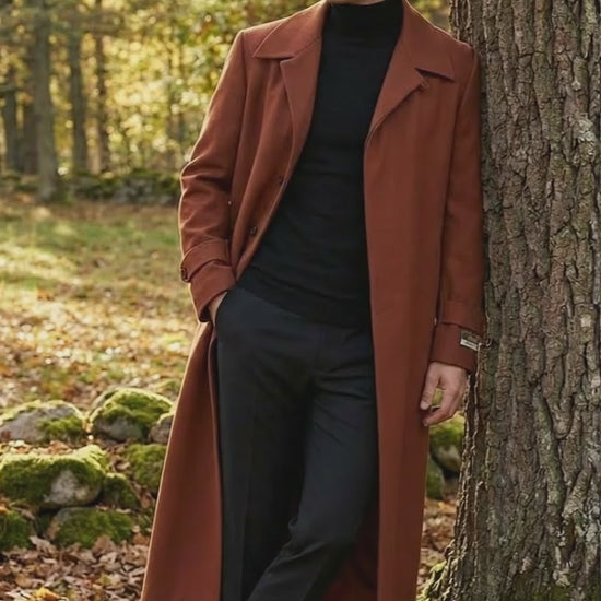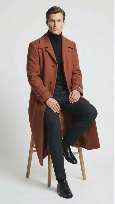 Men’s Full-Length Cognac Overcoat – Premium Wool-Blend Long Dress Coat for Winter and Formal Wear in Rust Brick Color