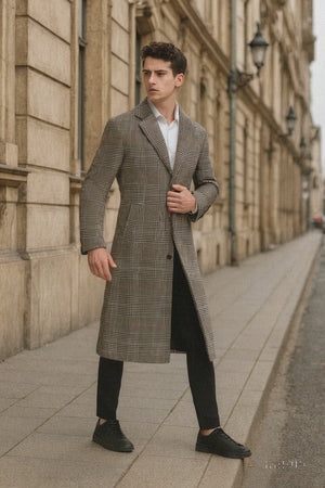 Men’s Full length Long Plaid Overcoat – Classic Checkered Wool Blend Winter Coat in Gray Color Checkered