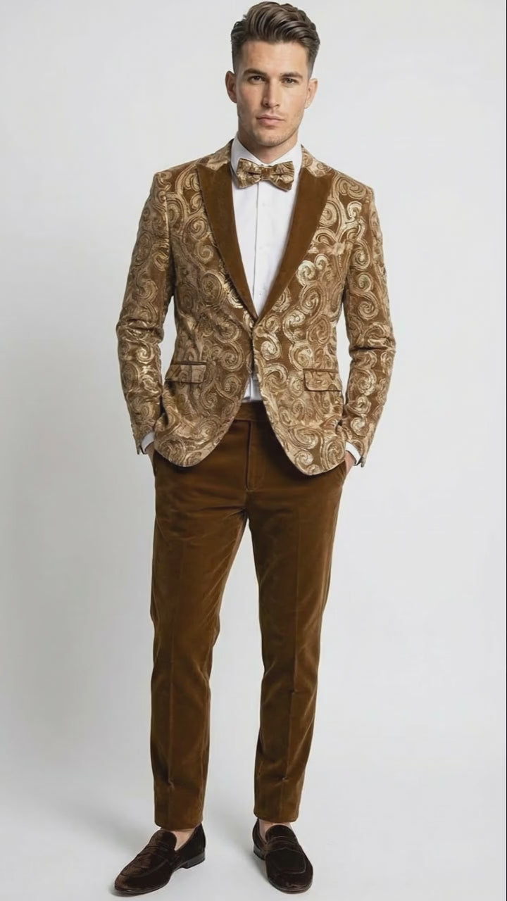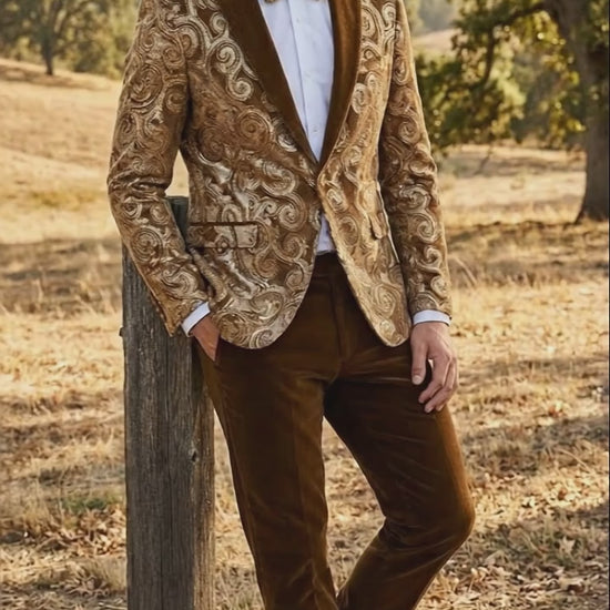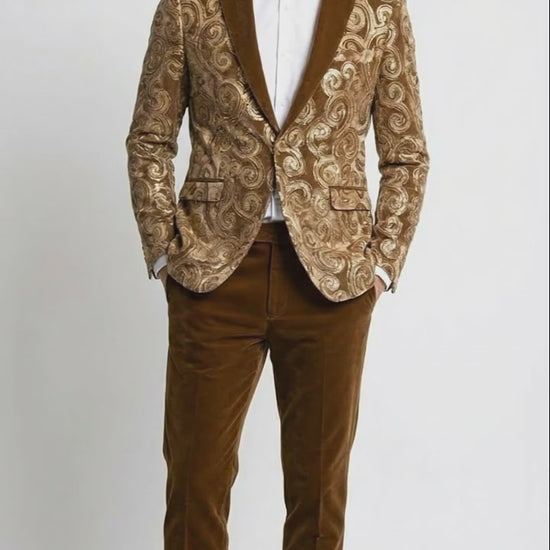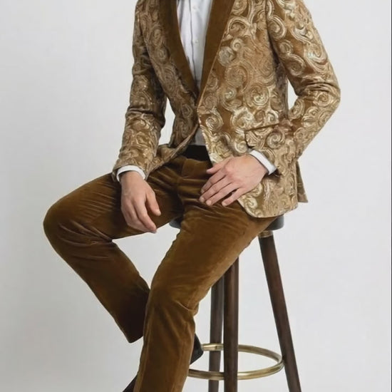 Men’s Goldish Light brown Tuxedo dinner Jacket Embroidered Blazer – Velvet Jacket for Formal Paisley Pattern Coffee Mocca Color