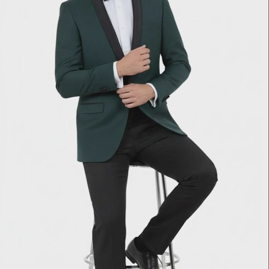 Men’s Green Tuxedo Suit – Slim Fit Jacket with Black Satin Shawl Lapel and Black Pants in Hunter Green