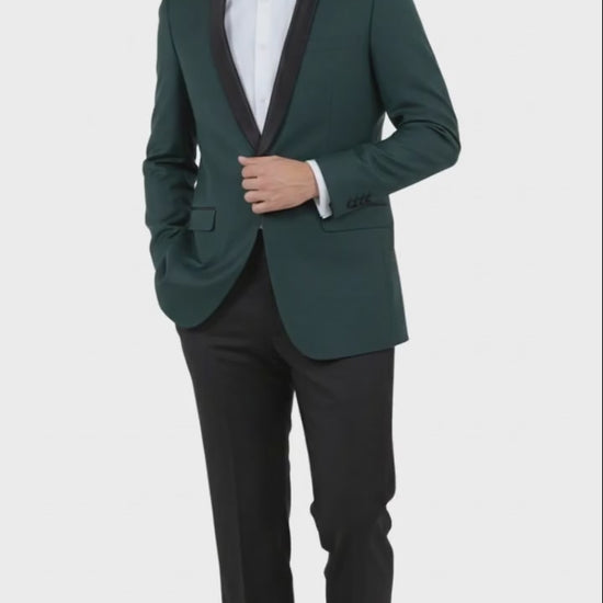 Green slim-fit tuxedo jacket with black satin shawl lapel
