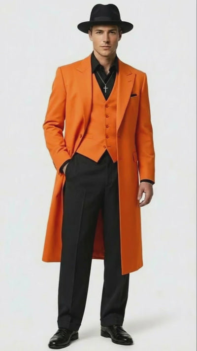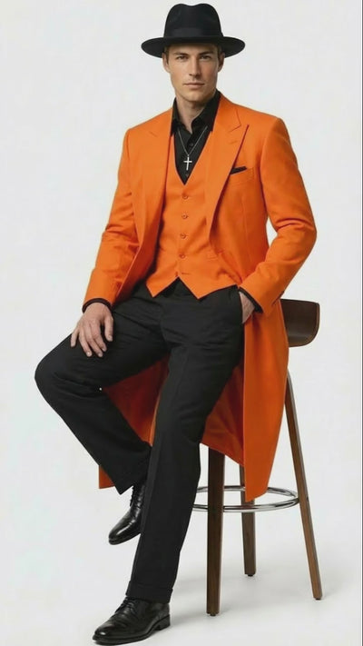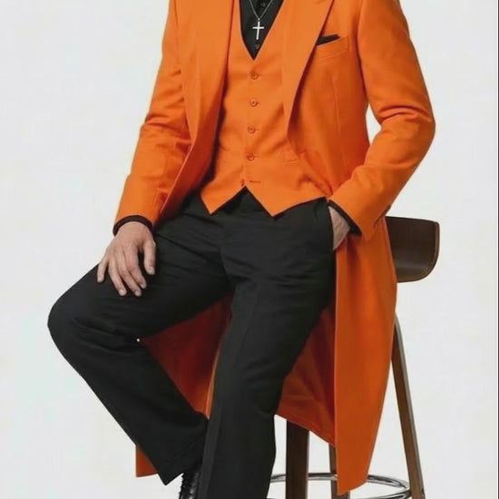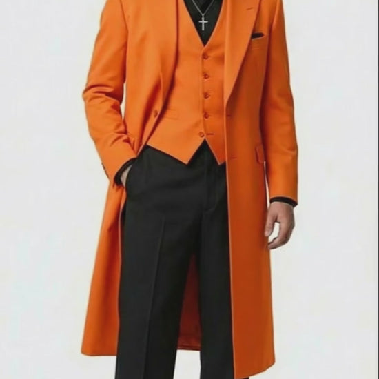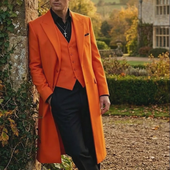 Make a bold and sophisticated statement with this Men’s Orange Long Coat Suit Set, designed for men who appreciate standout style with a refined edge. This elegant three-piece outfit features a long tailored coat paired with a matching vest and classic black trousers, creating a striking contrast that commands attention.