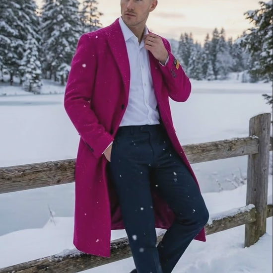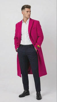 Make a bold style statement with this Men’s Hot Pink Wool Blend Overcoat, designed for men who want standout elegance with modern tailoring. Crafted in a vibrant pink tone, this long coat delivers a sharp, fashion-forward look while maintaining a refined and structured silhouette.