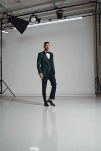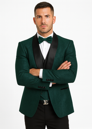 This tuxedo embodies bold refinement, luxury, and charisma. The emerald green color symbolizes prosperity and distinction, while the satin accents and jacquard finish bring out artistic craftsmanship.
