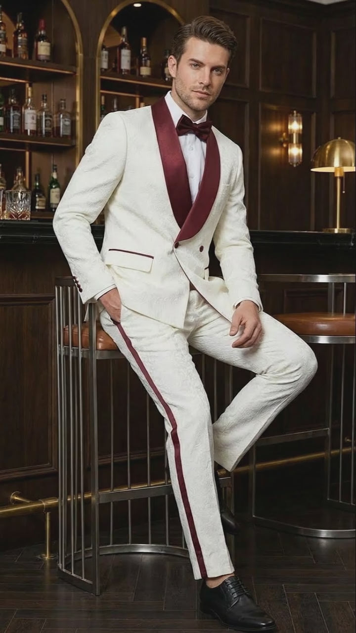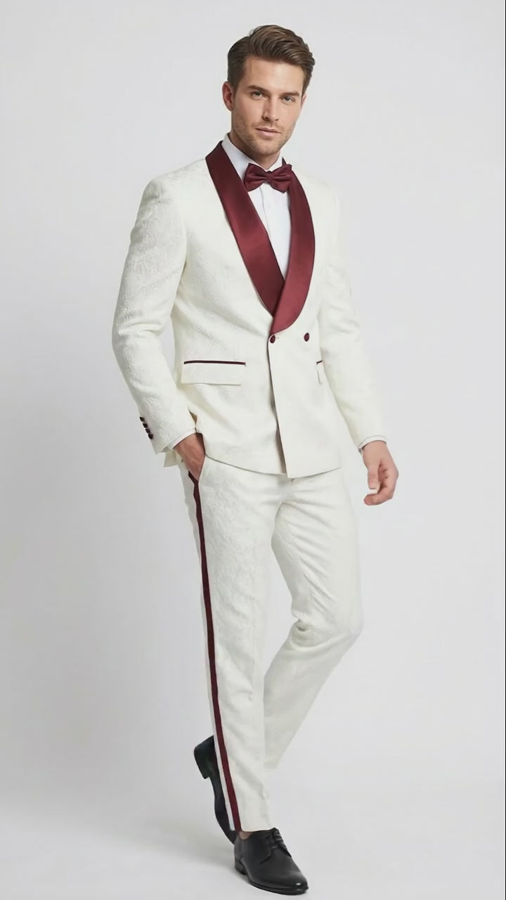 Men’s Ivory and Burgundy Jacquard Tuxedo Suit – Luxury Slim Fit 3-Piece Formal Wedding, Prom, and Gala Outfit in Cream Off White Color