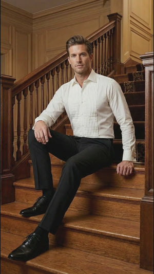 - Style: Pleated front tuxedo dress shirt