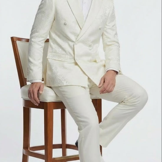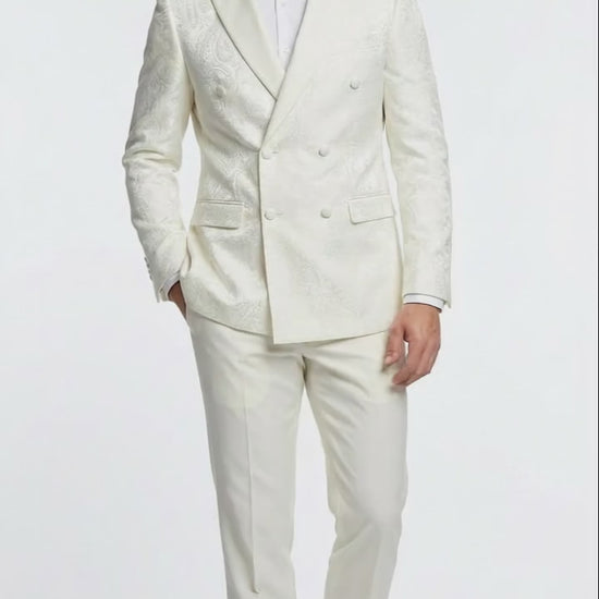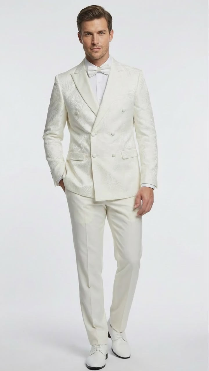 Men’s Ivory Double Breasted Tuxedo Dinner Jacket – Textured Blazer Paisley Texture Pattern in Off White Cream Color + Bowtie