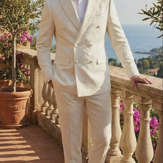 Make a refined statement with this Men’s Ivory Double Breasted Tuxedo Dinner Jacket off white ivory color , designed for luxury formalwear and special occasions. Featuring a textured double breasted blazer with peak lapels and matching tailored trousers, this suit delivers a sharp, elegant silhouette with timeless appeal.