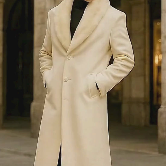 Men’s Ivory Full-Length Overcoat with Luxurious Faux Fur Shawl Collar – Winter Dress Coat