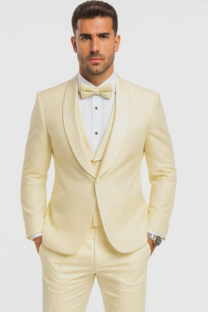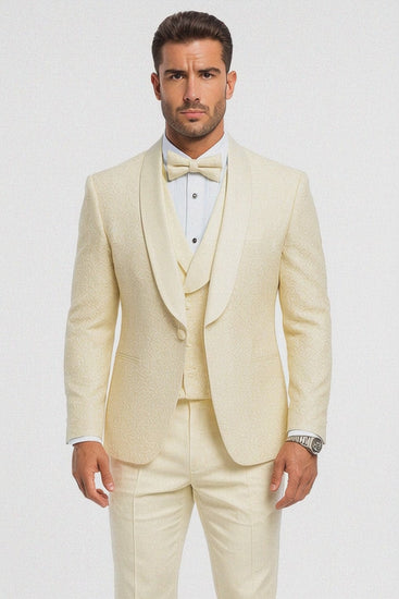 This Ivory Cream Jacquard Tuxedo Suit redefines timeless elegance. It’s a masterfully tailored three-piece suit designed for men who appreciate sophistication, texture, and high-end craftsmanship. The light ivory tone gives it a regal presence, making it ideal for grand celebrations, weddings, and red-carpet events.