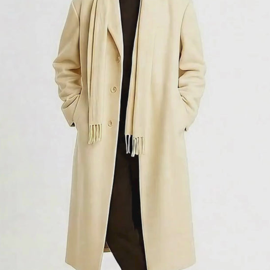 Step into timeless sophistication with this men’s long cream overcoat, complete with a matching scarf and hat for a refined and coordinated look. Crafted from premium fabric, this overcoat is designed to keep you warm while maintaining a polished, luxurious appearance.
