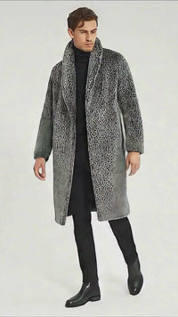 Men’s Luxury Long Grey Faux Fur Coat – Winter Overcoat with Animal Print Design