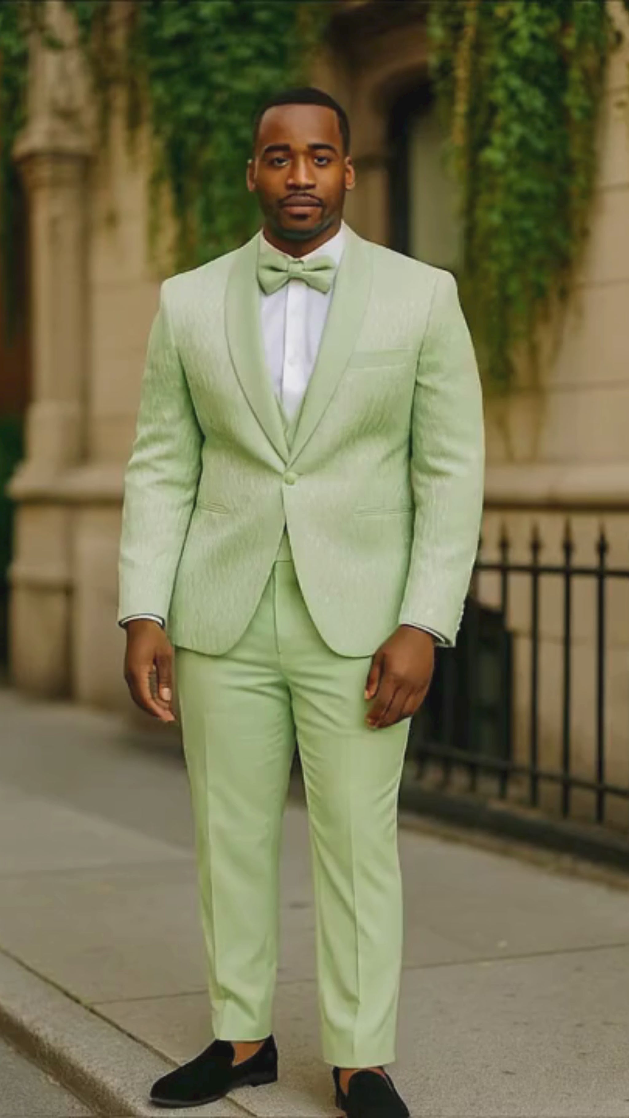 Turn heads at any formal event with this men’s mint green tuxedo suit - Sage Green - Light Green crafted for a modern and elegant appearance. Featuring a sleek slim fit and a matching bow tie, this suit offers a bold yet sophisticated look that’s perfect for weddings, proms, and upscale occasions.