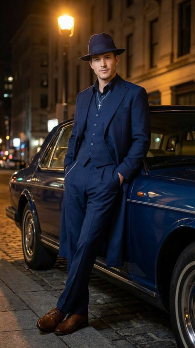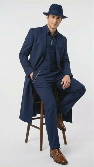 Step into classic crime-era elegance with this Men’s Navy Blue 1920s Zoot Suit, inspired by the bold style of vintage mafia and gangster fashion. This premium three-piece ensemble includes a dramatic long overcoat, matching vest, and wide-leg trousers, capturing the iconic silhouette that made zoot suits legendary.