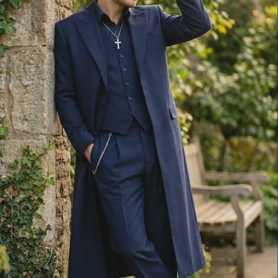 Crafted from quality fabric with a smooth, refined finish, this navy suit blends historical authenticity with modern comfort. The long jacket adds a commanding presence, while the tailored vest and relaxed trousers complete the striking retro look. Perfect for themed events, theater productions, photo shoots, costume parties, and standout formalwear.