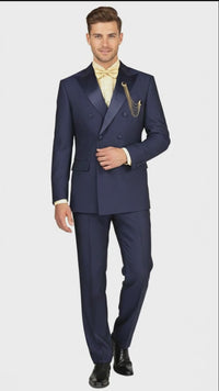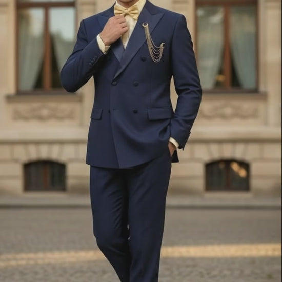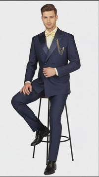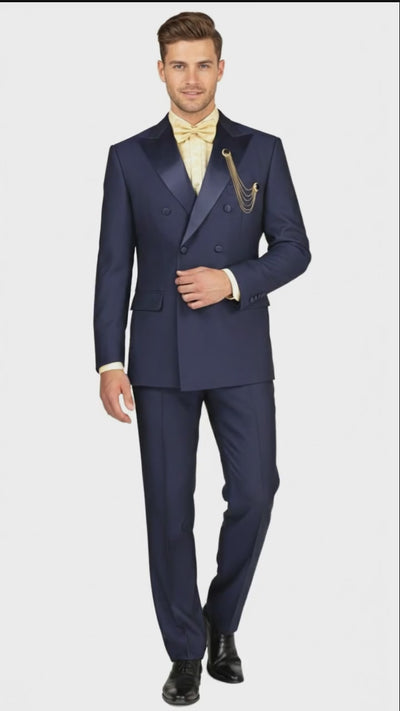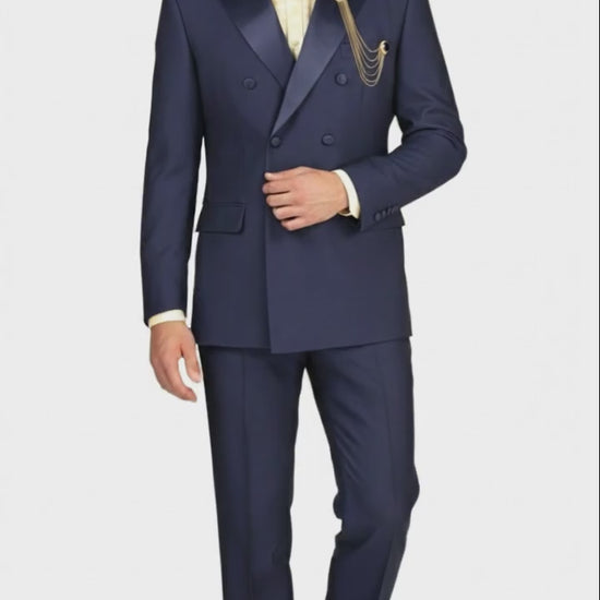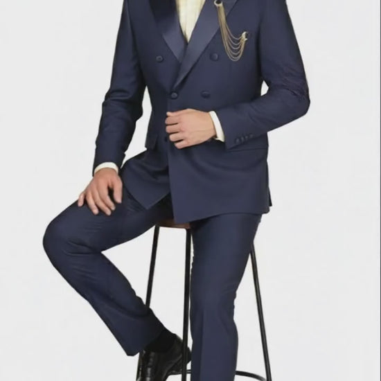 Men’s Navy Blue Double-Breasted Tuxedo with navy Satin Peak Lapel Wedding Suit