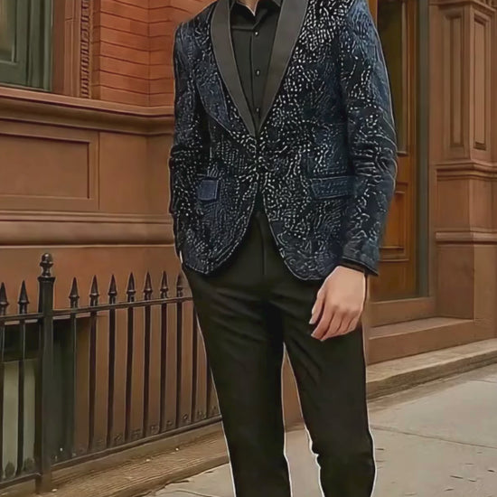 This navy blue sequin blazer is designed for men who want to stand out and make a memorable impression. Pair it with black dress pants, a crisp white shirt, and polished dress shoes to complete your luxurious formal ensemble.