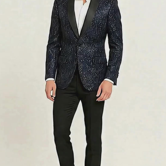 Men’s Navy Blue Sequin Tuxedo Jacket with Black Satin Shawl Lapel – Luxury Prom and Wedding Blazer