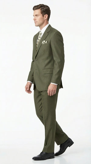 Olive green tuxedo suit crafted with premium formal suiting fabric featuring a classic tuxedo jacket and matching trousers designed for weddings, prom nights, black tie events, and formal occasions.
