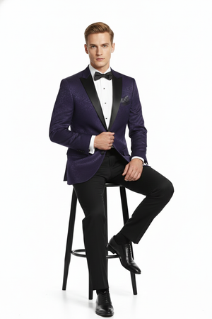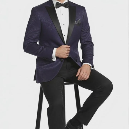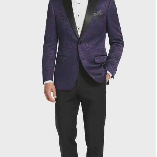 Men’s Purple Paisley Tuxedo Jacket – Ultra Slim Fit Dinner Blazer with Black Satin Peak Lapel
