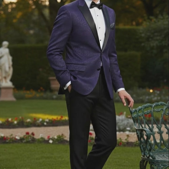 - Purple paisley tuxedo jacket with black satin shawl lapel
