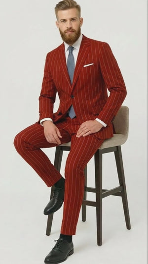 Perfect for weddings, formal events, business settings, evening occasions, and special celebrations, this burgundy red pinstripe suit pairs effortlessly with dress shirts and ties for a sharp, commanding appearance.
