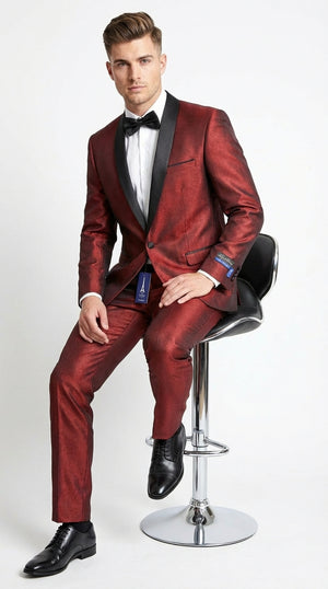 Men’s Shiny Burgundy Satin Tuxedo Jacket with Black Shawl Lapel | Formal Wedding & Prom Blazer - Sharkskin Fabric
