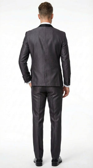Men’s Shiny Sateen Charcoal Gray Tuxedo 3 Piece Suit with Black Shawl Lapel | Formal Wedding Prom Suit Sharkskin