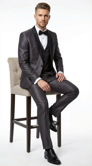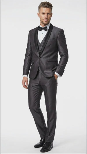 Men’s Shiny Sateen Charcoal Gray Tuxedo Three Piece Suit with Black Shawl Lapel | Formal Wedding Prom Suit Sharkskin