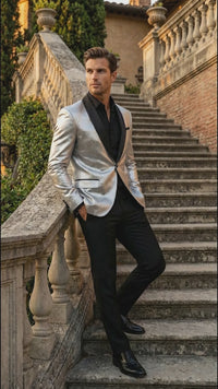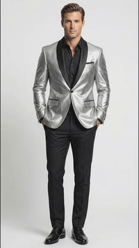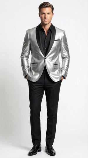 Men’s Shiny Silver Blazer with Black Lapel – Luxury Metallic Formal Jacket for Party, Evening and Special Events