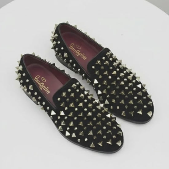 Men’s Studded Velvet Loafers – Designer Party and Prom Dress Shoes with Gold and Silver Spikes