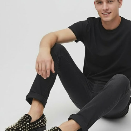 Add bold sophistication to your wardrobe with these Men’s Studded Velvet Loafers, designed to make a powerful fashion statement. Crafted from luxurious velvet and adorned with metallic spikes, these slip-on dress shoes combine comfort, confidence, and creativity.
