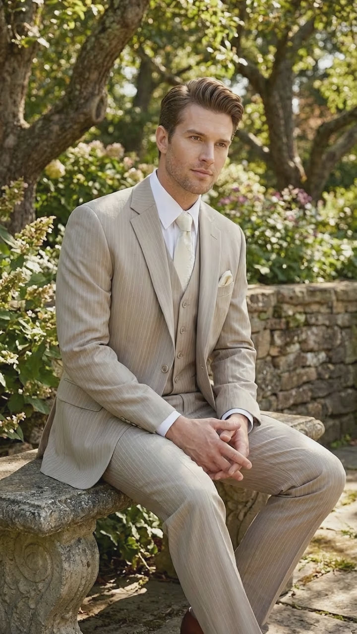 This men’s tan pinstripe three piece suit is ideal for customers searching for tan wedding suits, pinstripe suits for men, church suits, business suits, groom suits, classic 3PC suits, and modern formalwear in tan
