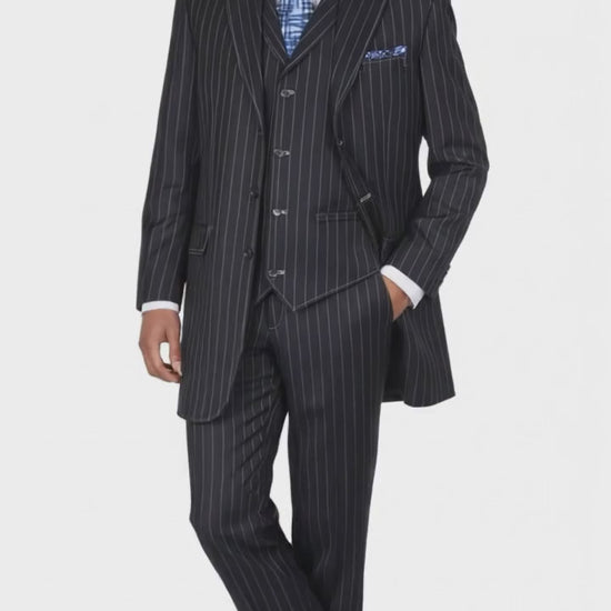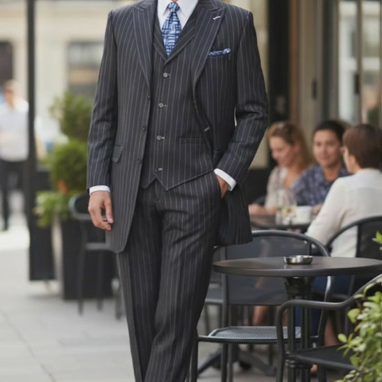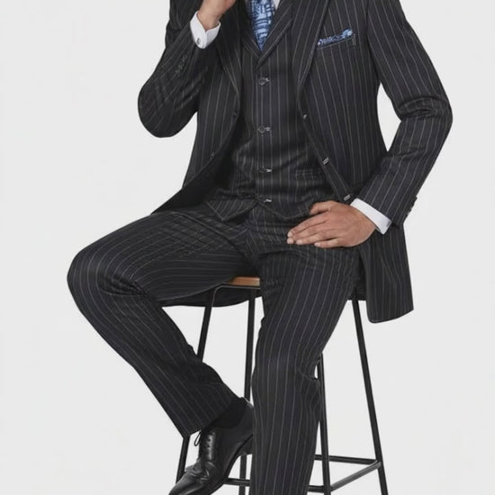 The distinctive white pinstripe pattern adds a sharp, professional edge, while the three-piece design—including a single-breasted jacket, matching vest, and trousers—ensures a refined, coordinated look. The notch lapel, button closure, and functional pockets complete the ensemble with style and practicality.