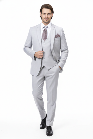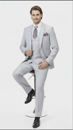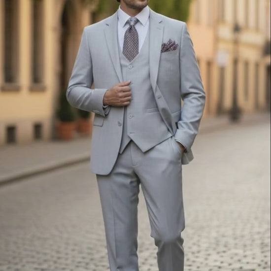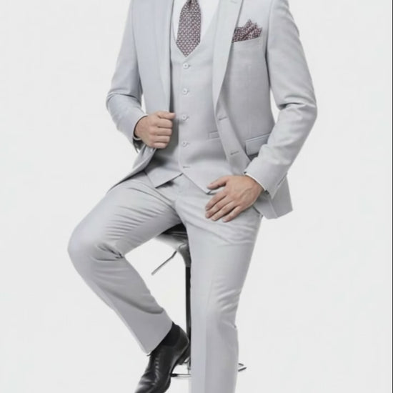 The light gray color provides a clean and versatile aesthetic, suitable for weddings, business meetings, celebrations, and upscale events. The jacket features a notch lapel, flap pockets, and structured tailoring that creates a sharp silhouette. The coordinating vest adds a sophisticated layered touch, while the tailored pants complete the ensemble with a sleek and professional finish.