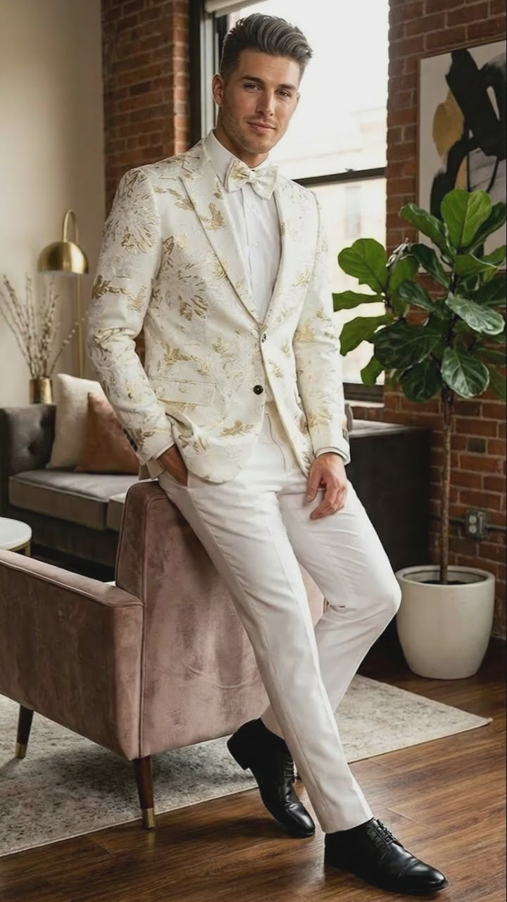 Make a refined and elegant statement with this men’s white and gold patterned blazer, designed for weddings, parties, and premium special occasions. Featuring a sophisticated floral-inspired pattern with gold detailing on a white base, this blazer delivers a luxurious and timeless look ideal for formal celebrations.