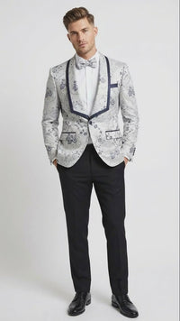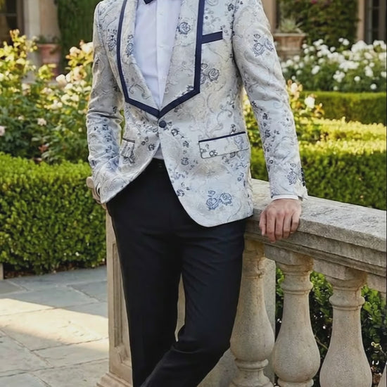 Men’s White and Navy Blue Lapel Floral Jacquard Blazer with Contrast Shawl Lapel – Luxury Wedding and Party Wear Jacket paisley Tuxedo Navy Pants