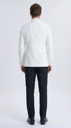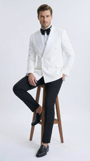 Men’s White Double Breasted Dinner Jacket Blazer with Black Pants – Formal Tuxedo Style Outfit for Weddings