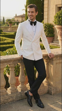 Upgrade your formal wardrobe with this men’s white suit blazer with black pants, designed for refined elegance and modern sophistication. Featuring a structured white double breasted blazer paired with classic black formal trousers, this outfit delivers a timeless tuxedo-inspired look ideal for upscale occasions.