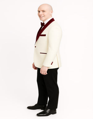 Men’s White Floral Tuxedo Jacket with Burgundy Velvet Shawl Lapel – Wedding, Prom, and Formal Event Suit