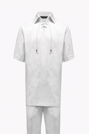 Step into effortless style with this men’s white lace-up two-piece outfit, designed for a modern yet relaxed look. Featuring a short-sleeve lace-up collar shirt paired with matching pants, this set blends comfort and sophistication. The unique lace-up neckline adds a stylish detail, making it a standout choice for summer wear.