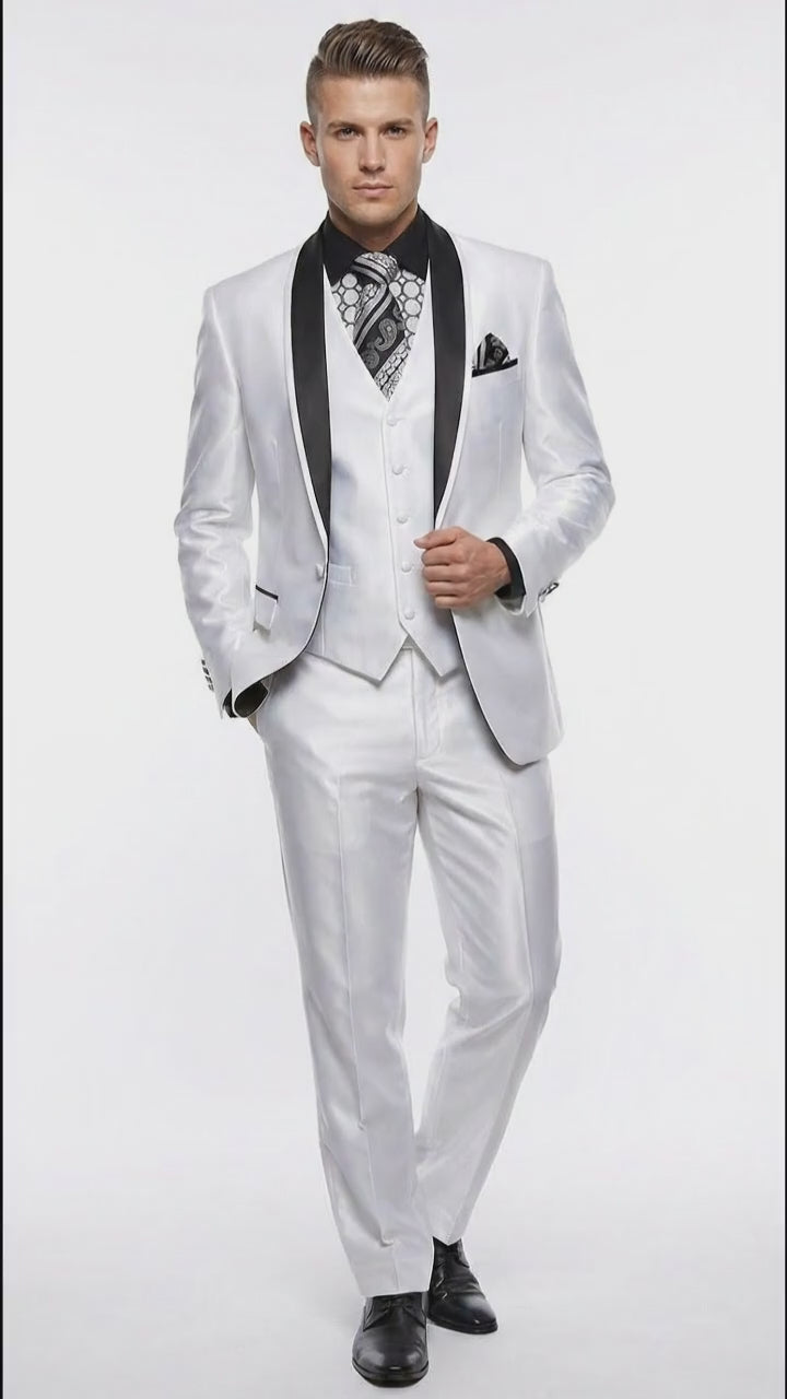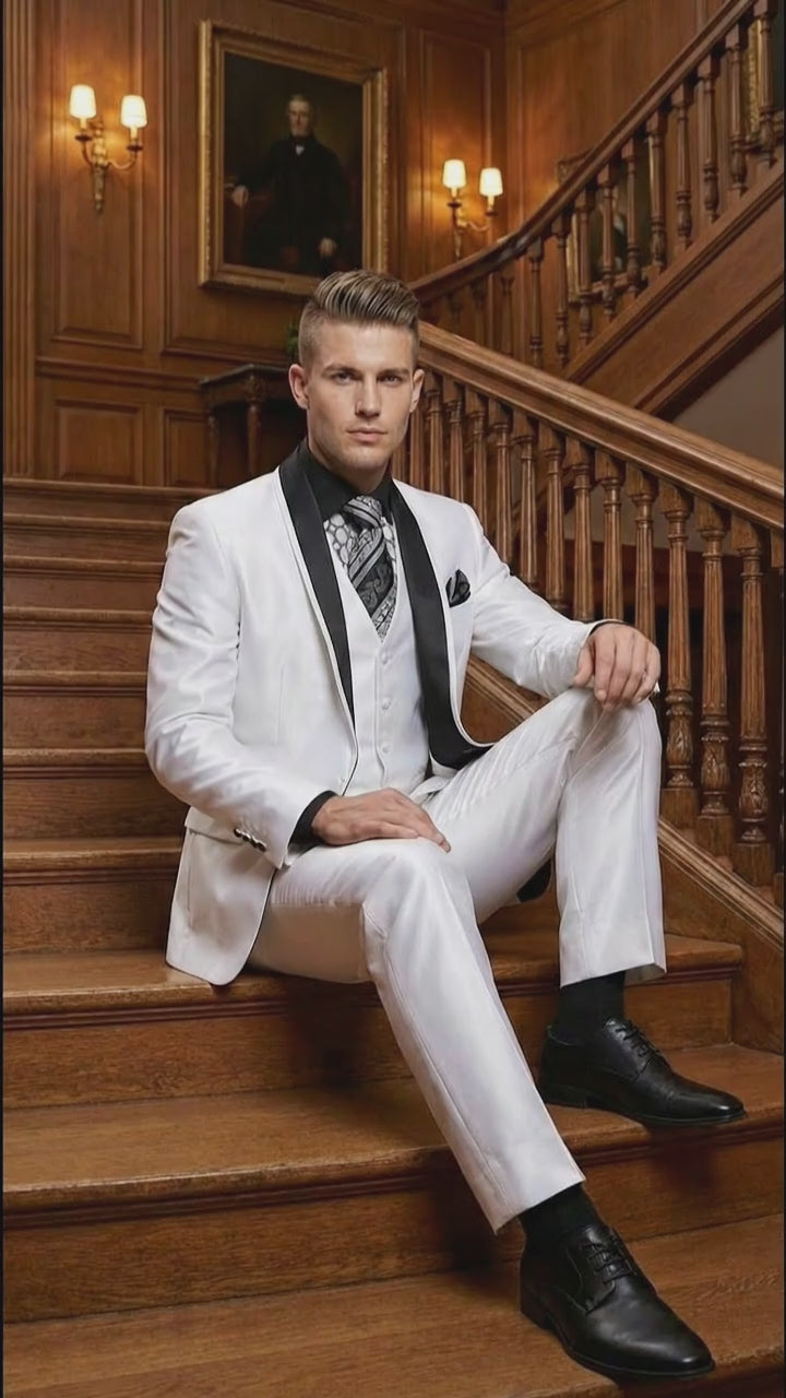 The suit features a striking black shawl lapel that creates a sharp contrast against the crisp white color, adding a timeless tuxedo finish. Tailored construction ensures a polished silhouette, while quality stitching and durable materials provide long-lasting comfort and wear. The shiny white fabric reflects light beautifully, giving this formal suit a high-end designer look.
