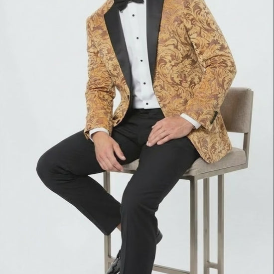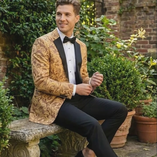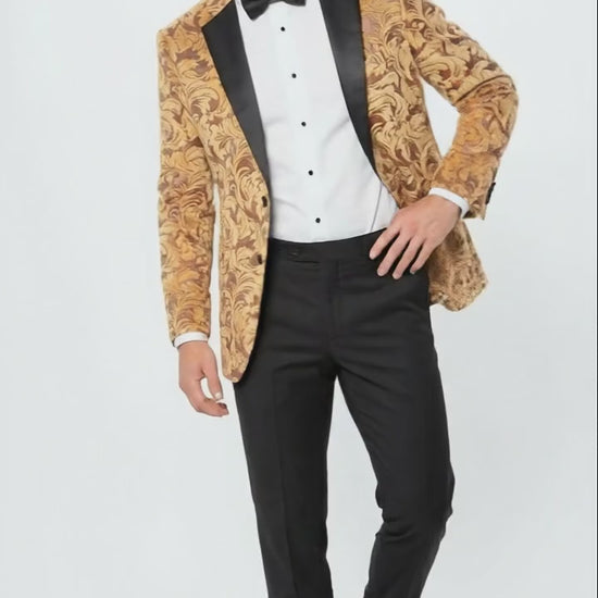 Men’s Yellow Gold Baroque Pattern Tuxedo Blazer Suit – Party and Wedding Jacket Prom Paisley Black Pants