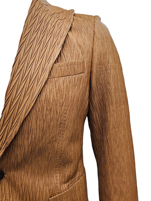 Slim Fit Suit, Peak Lapel, 1 Button, Tan Tender Crush Fabric, Patch Pocket, Side Vents, Matching Pants.