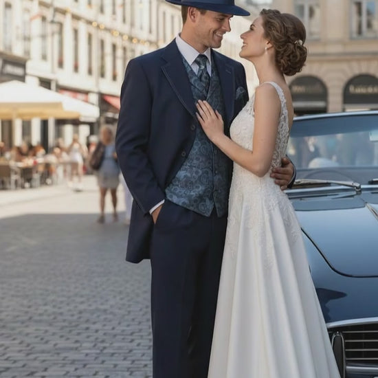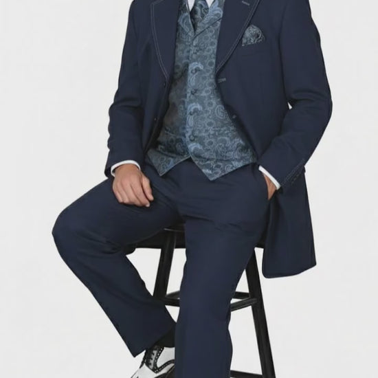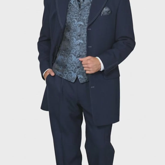 - Classic navy blue color with paisley patterned vest and tie